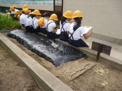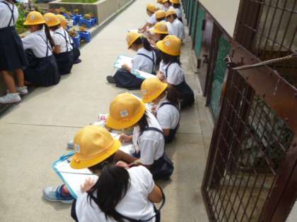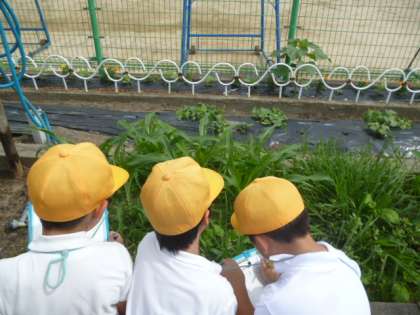 2年生の畑で育てているトウモロコシを観察し、絵を描いてまとめています。みんなよく観察できています。