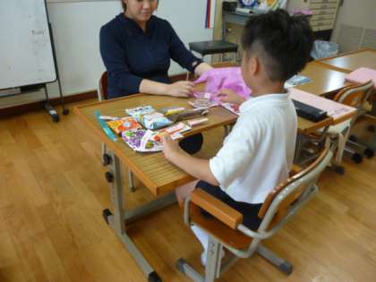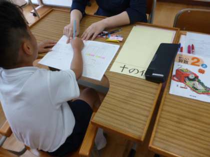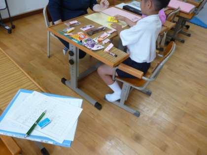 先生の公開授業があり、たくさんの先生が見に来てくれました。買い物ごっこをしたり、二けたの足し算をひっ算で計算したりしました。先生に囲まれて楽しく学習をすることができました。