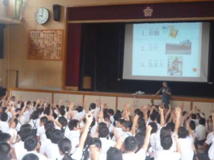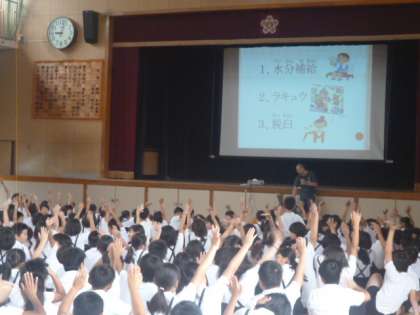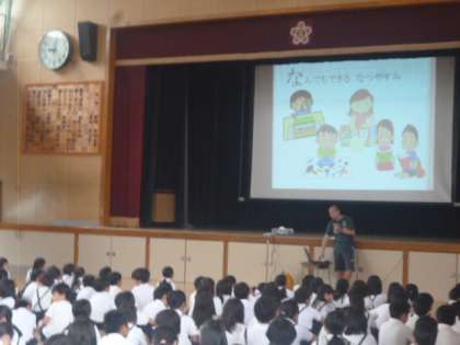 映像による夏休みの生活についてのお話でした。クイズではちょっと昭和的なものもありましたが、みんなわざと間違えたり、大きな声で正解を言ったりしながら、楽しく学ぶことができました。