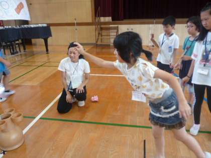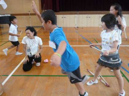 中学年の部の様子です。トゥホとペンイをしています。狙ったところに入れて得点をあげています。ペンイも慣れている人が多く、上手に回すことができました。