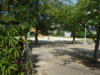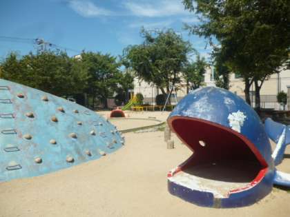 毎日、先生たちは児童のみなさんが困っていることがないか、校区内を自転車で回っています。この日は午後2時ごろに「クジラ公園」や「さくら公園」を回りました。暑さのせいか、公園ではあまり姿を見ることはできませんでした。確かに!これだけ暑いとねえ〜。クジラさんが少し寂しそうでした。