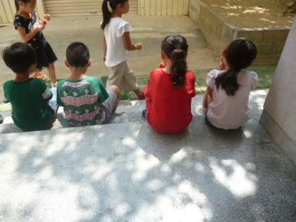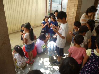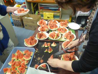 昨日収穫したスイカを,一晩冷蔵庫でねかせてキンキンに冷やし,今日,いきいき教室に来ていた子どもたちが食べました。先生も少しいただきましたが「甘さひかえめ,とってもジューシー(すごく水分の多い)!」おいしかったです。夏ですねえ〜。