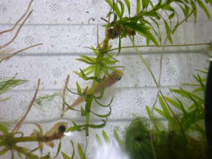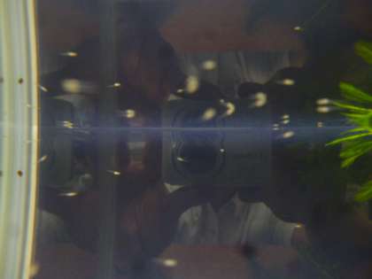 玄関を入ったところに池があります。アオミドロが大量に発生していて中があまり見えませんでしたが,メダカがいます。管理作業員さんが,この暑い中きれいに掃除してくれて,そこにいたメダカを管理作業員室の水槽へ一時避難させていました。すると,たくさん卵を産み,たくさんメダカの赤ちゃんが誕生しました!! わかりますか? もう少し大きくなったら池に返してやるそうです。2学期に観察する楽しみが増えましたね。