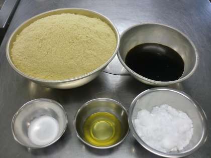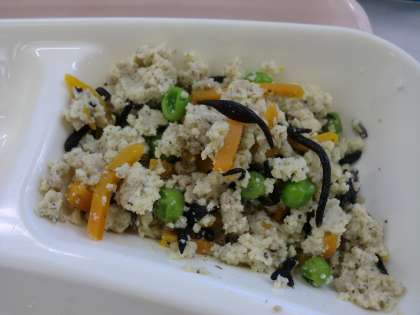「高野豆腐の炒り煮」は、油で豚挽肉を炒め、にんじんともどしたひじきを炒め、だしを加えて煮ます。砂糖、塩、薄口しょうゆで味付けし、グリンピースを加えて最後に高野豆腐の粉末を一気に加えて煮上げます。粉末の高野豆腐は、食べやすく高野豆腐の苦手な子も「美味しい!」と言って食べています。ご飯によく合う献立です。
