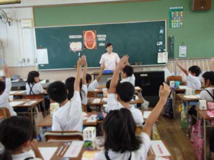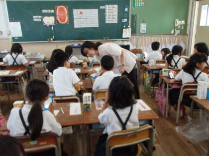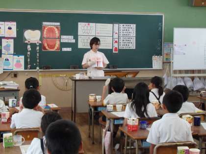歯科衛生士さんによる歯みがき指導がありました。むし歯を予防するためのていねいな歯みがきの仕方を学びました。染め出し液を使って、普段の自分の歯みがきが、きちんとできているかチェックをしました。