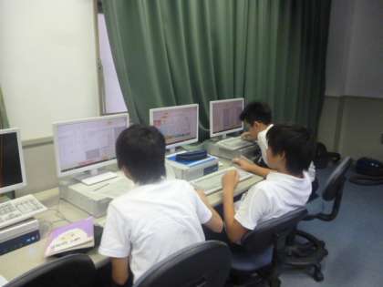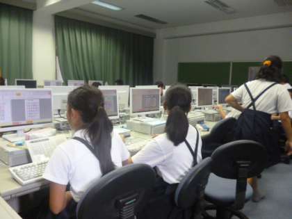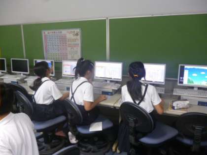 メディアルームでパソコンを使い、2学期の時間割表を作成しています。終わった人から修学旅行の調べ学習をしています。