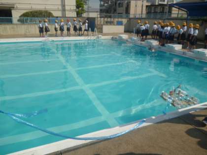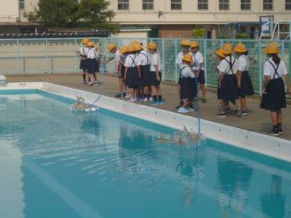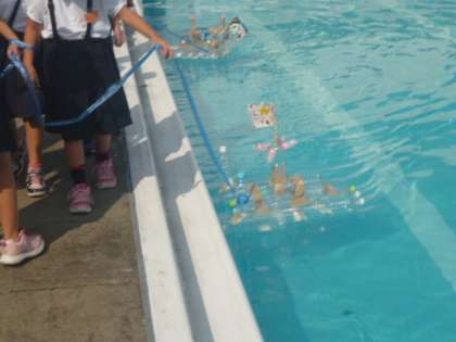 生活科の授業でつくったペットボトルのボートをプールに浮かべています。きっちり浮いて、上手に進んでいました。