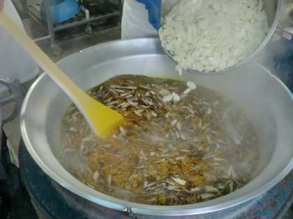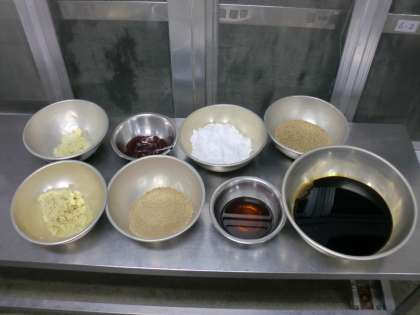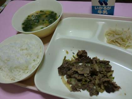 今日は韓国・朝鮮の料理です。「プルコギ」は、牛肉にすりおろしたしょうがとにんにく、砂糖、こい口しょうゆ、コチジャン、ごま油、いりごま、すりごまの8種類を合わせた「給食特製の手作り焼肉のたれ」に漬け込み、たまねぎとピーマンを合わせて焼き物機で焼き上げます。