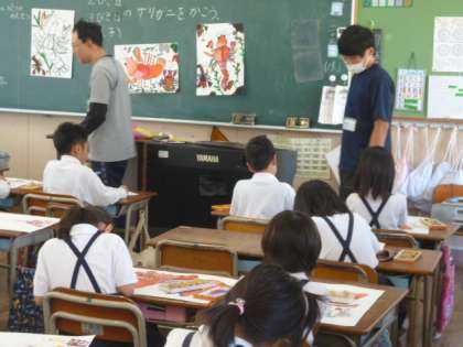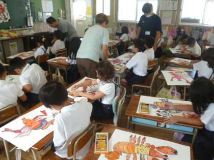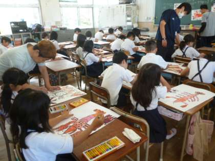 2匹目、3匹目のザリガニを描いています。1匹目の大きなザリガニと少し小さなザリガニがとてもかわいらしいです。
