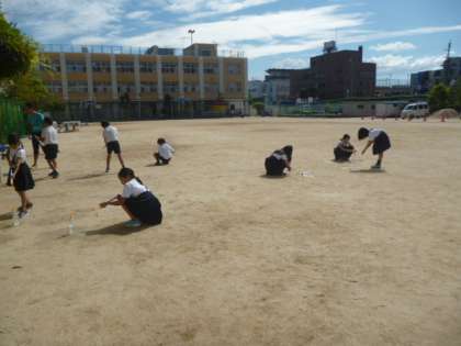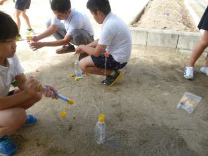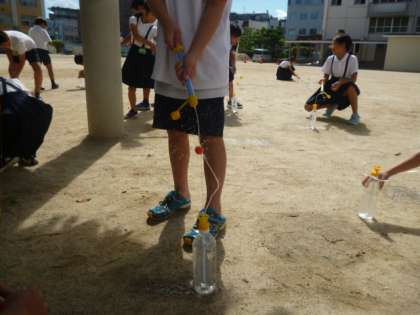 空気を閉じ込めようの実験です。ペットボトルに水を入れ、空気をおくりこむと、あら不思議。噴水になって、ボールを押し出します。上がったボールが、ゴールかごにもどってくると、歓声をあげていました。