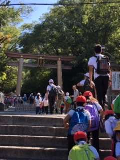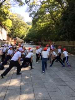 枚岡神社へ到着しました。今から山を登ります。その前に準備体操?