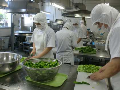 「他人丼」は、牛肉と鶏卵を主材に玉ねぎ、にんじんを加え、斜め切りの青ねぎで彩りよく仕上げています。鶏卵の食物アレルギーがある児童には、鶏卵の除去食を提供しています。