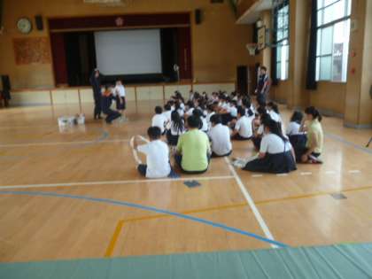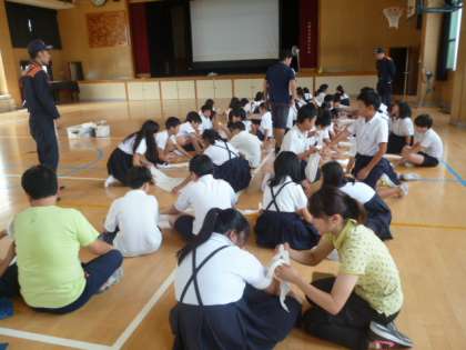 応急処置の様子です。三角巾を使って、止血方法や固定の仕方などを学びました。