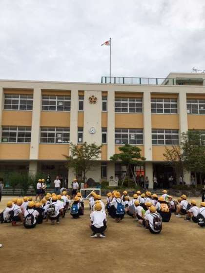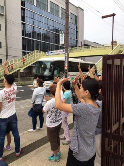 いよいよ修学旅行当日です。お天気は曇り空ですが、心は晴々! 沢山のお家の方や先生方に見送られて、元気いっぱい「いってきます」!!