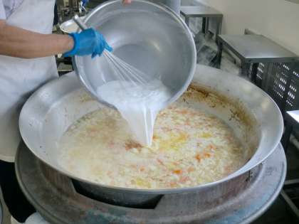 「コーンクリームシチュー」は、小麦アレルギーのある児童生徒も食べられるように、上新粉を使ってとろみをつけています。スイートコーン(クリーム缶)、コーンの他に、鶏肉、ベーコン、じゃがいも、たまねぎ、にんじん、グリンピースを使っています。