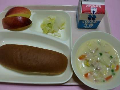 ★コーンクリームシチュー[米粉]・はくさいのピクルス・りんご・黒糖パン・牛乳