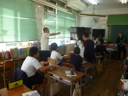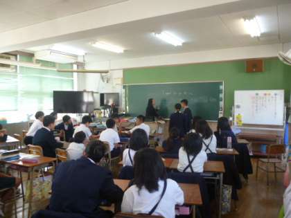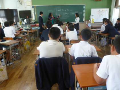 C-NETの先生との英語の授業です。先生が行きたい国はどこでしょう?クイズを男子VS女子でしています。先生が間違えて?「ちがうやん」と盛り上がる場面もありました。
