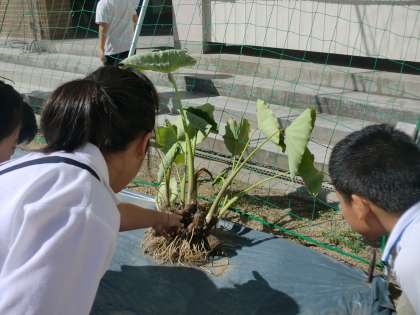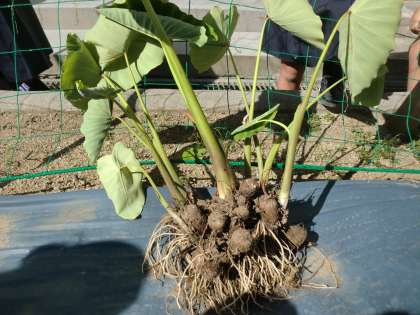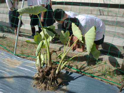 学習園で栽培している「里芋」です。掘り出すと、こんなに立派にできていました。里芋は「子芋」とも言い、小さい芋が茎の根元の周りに何個もついています。里芋はこの時期に「旬」を迎えます。