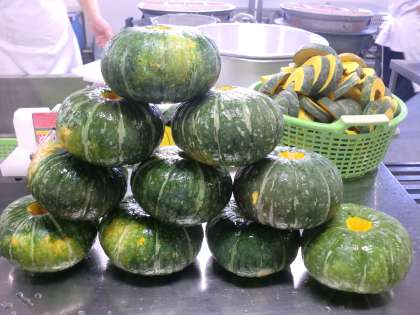 「かぼちゃのいとこ煮」は、煮上げたかぼちゃに、 新食品の ドライパックの あ ずきを加えて煮、火をきってしばらく味を煮含めます。