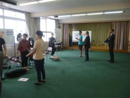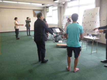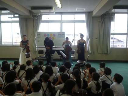 今日は特別に弦楽四重奏団《カルテット・むーちょ》によるふれあいコンサートの日です。コンサートの前には担任の先生がボイスパーカッションの練習をしました。
