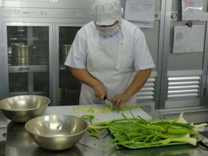 1枚目の写真は、セロリを細かく切っているところです。また、2枚目の写真にもありますが、ラッキーにんじんを入れています。型を抜いた後のにんじんも意外に子どもたちが喜ぶので、「裏ラッキー」として入れています。