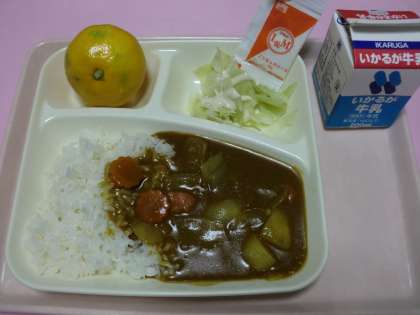 ☆ポークカレーライス(米粉)・キャベツのサラダ(ノンエッグドレッシング)・みかん・牛乳