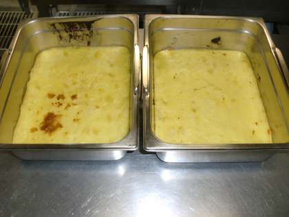 「スイートポテト」は、煮崩れるくらいまで柔らかく煮たさつまいもに、砂糖、バター、牛乳、生クリームを加えて煮たものを、ミニバットに入れて焼きます。秋の味覚の手作りデザートに、子どもたちも大喜びでした。