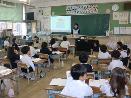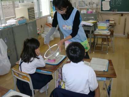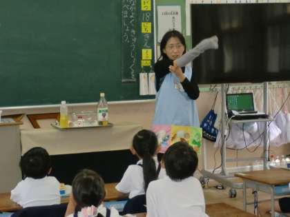 1年生の国語「サラダで元気」で、アフリカゾウが油と酢と塩でドレッシングを作る場面です。食育との連携で、実際にドレッシングを作って子どもたちに見てもらいました。