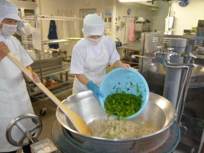 「豚肉といかの中華煮 」は、 豚肉といかを主材にした中華風の煮ものです。あつあげを使用することで、ボリュームが出るようにしています。はくさい、たまねぎ、にんじん、青みににらを使用しています。豆板醤を使って、少しピリッと感を出しています。