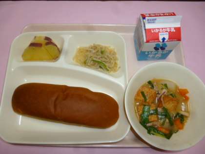 もやしとピーマンのいためもの・黒糖パン・牛乳