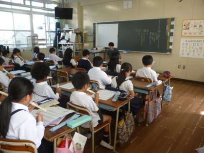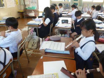 職員室に笛の音色が聞こえてきたので、教室に行ってみると3年生が花笛の練習中でした。きれいな音色ですよ。