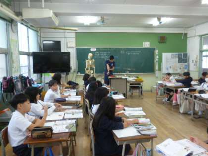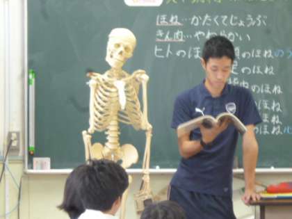 筋肉や骨について学んでいます。自分のからだのことなので、しっかり覚えよう。