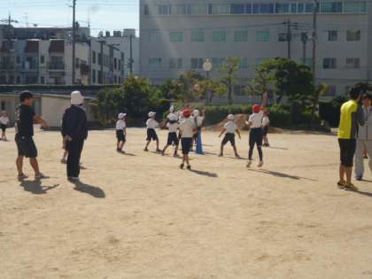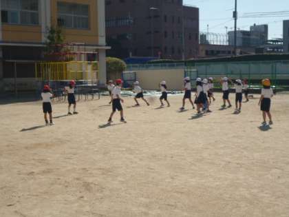 中チームVS外チームで対戦しました。円の外から外チームが一番中心にあるコーンをどれだけあてれるかを競うゲームです。自分で動いたり、パスをしたりして工夫していました。内チームを負けじと、しっかり守っていました。楽しく活動していました。