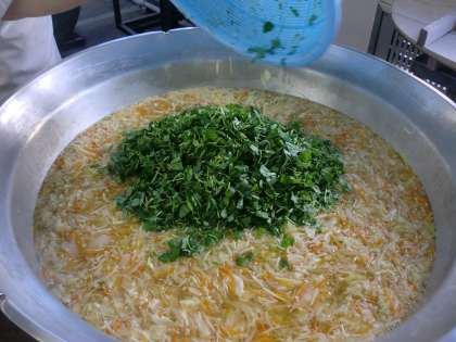 「すまし汁」は、キャベツ 、たまねぎ、 たけのこ、にんじん などを使い、青みにみつばを使っています。