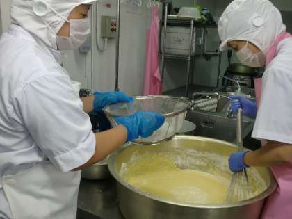 今日は、小中合わせて約100個の卵を1個ずつ割って確認しながら調理をしています。小麦粉をふるいにかけながら、混ぜていくとだまにならず美味しく仕上がります。やまいもとろろを加えることで、しっとりふんわり焼き上がります。