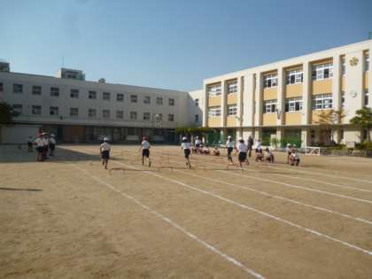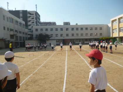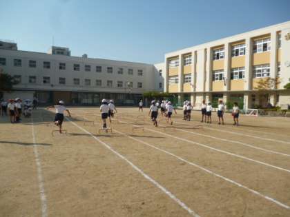 ハードルの練習をしています。半分にわかれて、友達の走り方を横からみて、お互いにアドバイスをしあっています。