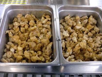 「あげどりのねぎだれかけ」 は、料理酒、しょうが汁で下味をつけた鶏肉 にでんぷんをまぶしてあげ ます。それに 白ねぎ、砂糖、米酢、こいくちしょうゆ、水、ごま油を合わせたタレを配缶時にかけます。たれの風味がよく、とても人気です。