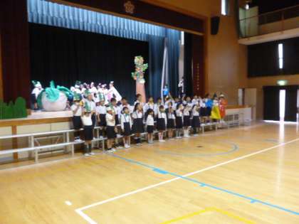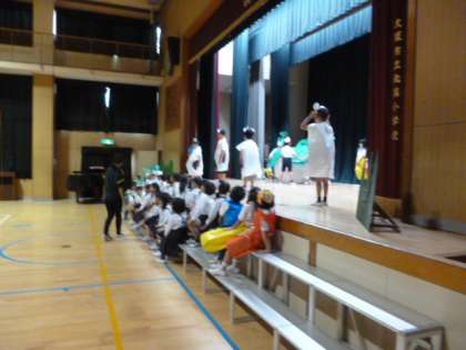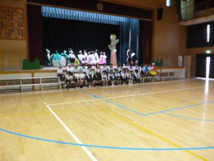 今日は衣装を着て、体育館で練習します。衣装を着ると、やはり全然違います。大きな声で、かわいく演技をしてくれていました。