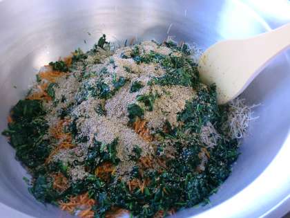 牛ひき肉、豚ひき肉を主材に、旬のだいこん、たっぷりのほうれんそうを使用しています。味付けにごま油やコチジャンを使っています。