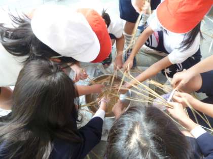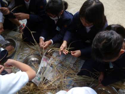 環境委員会が育てた「もち米」を、稲穂から籾をはずす「脱穀体験」をしています。今日は、小さい学年の子どもたちも、喜んでお手伝いに参加していました。