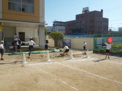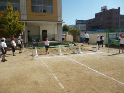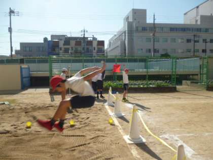 2組は走り幅跳びの練習をしています。コーンの間にテープを張って、高く跳ぶ工夫をしています。