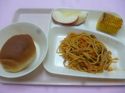 ☆きのこのスパゲッティ・焼きとうもろこし・りんご・黒糖ロール・牛乳