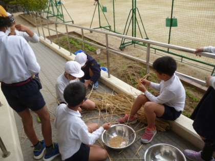 休み時間 脱穀の様子
