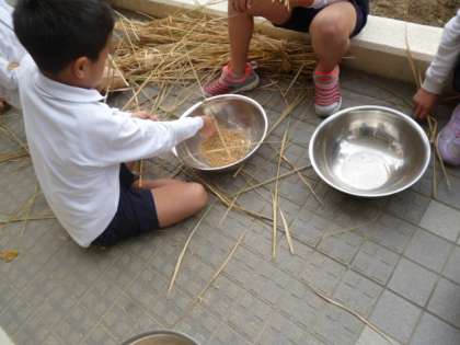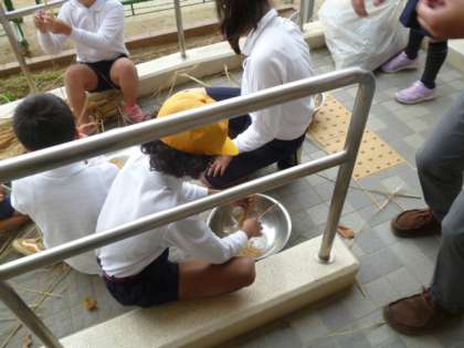 学校で育てた稲の脱穀が、今日で最後になりました。いつも手伝ってくれている人は随分と手つきが慣れてきました。