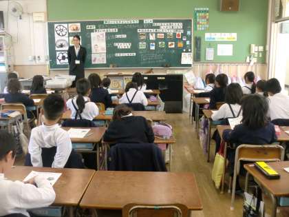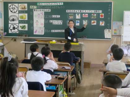 先週から1週間栄養教諭の実習生が2年生の教室で指導法などを学んでいました。今日は、その最終日です。子どもたちと楽しく「野さいとなかよしになろう」について授業をしました。
