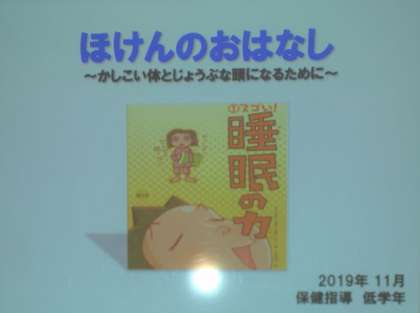 18日と19日には、1・2年生の保健指導を実施しました。絵本「すごい!睡眠の力」を使い、夜寝ている間に睡眠の神様がしてくれている4つのこと(1.元気を回復する。2.成長を助ける。3.記憶力を高める。4.病気を予防する。)について学習しました。なぜ、早寝早起きが大切なのかを学ぶことができたと思います。子どもたちは「お家の人にも教えてあげる‼」とはりきっていました。