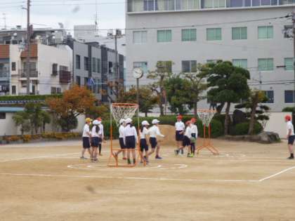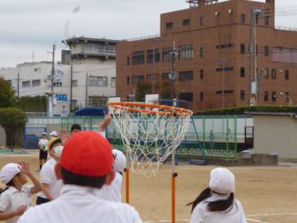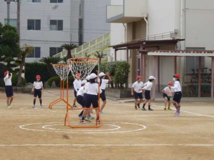 運動場でセストボールをしています。バスケットボールのゴールよりも大きいため、シュートが入りやすくなっています。ナイスシュート!