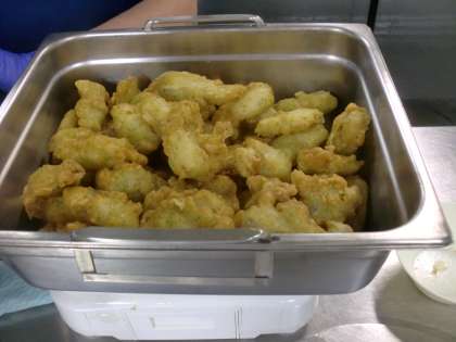 「白身魚のフリッター」は、なたね油で十分にあげています。「タラ」に卵を使わない衣をつけたフリッターです。