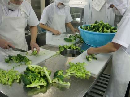 「ブロッコリーのサラダ」は、ブロッコリーは塩ゆでするか、焼き物機で蒸し、砂糖、こしょう、りんご酢、うすくちしょうゆ、綿実油を合わせたドレッシングを配缶時にブロッコリーにかけてあえます 。