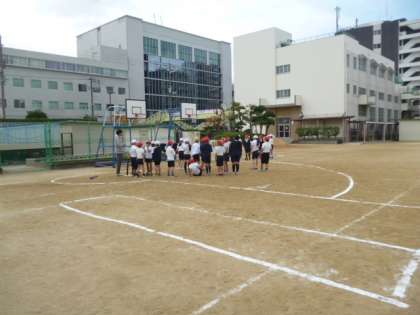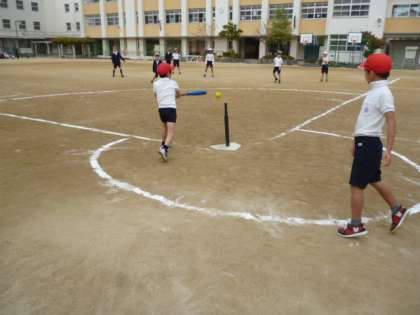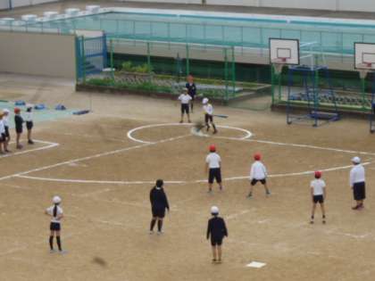ティーボールをしています。今日は3つのチームに分かれて試合をしています。試合をしていないチームはラダーで体力づくりをしています。がんばれ!